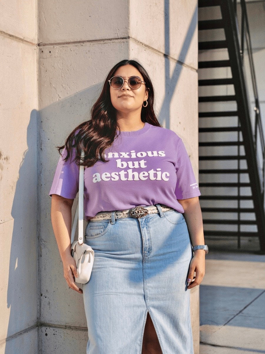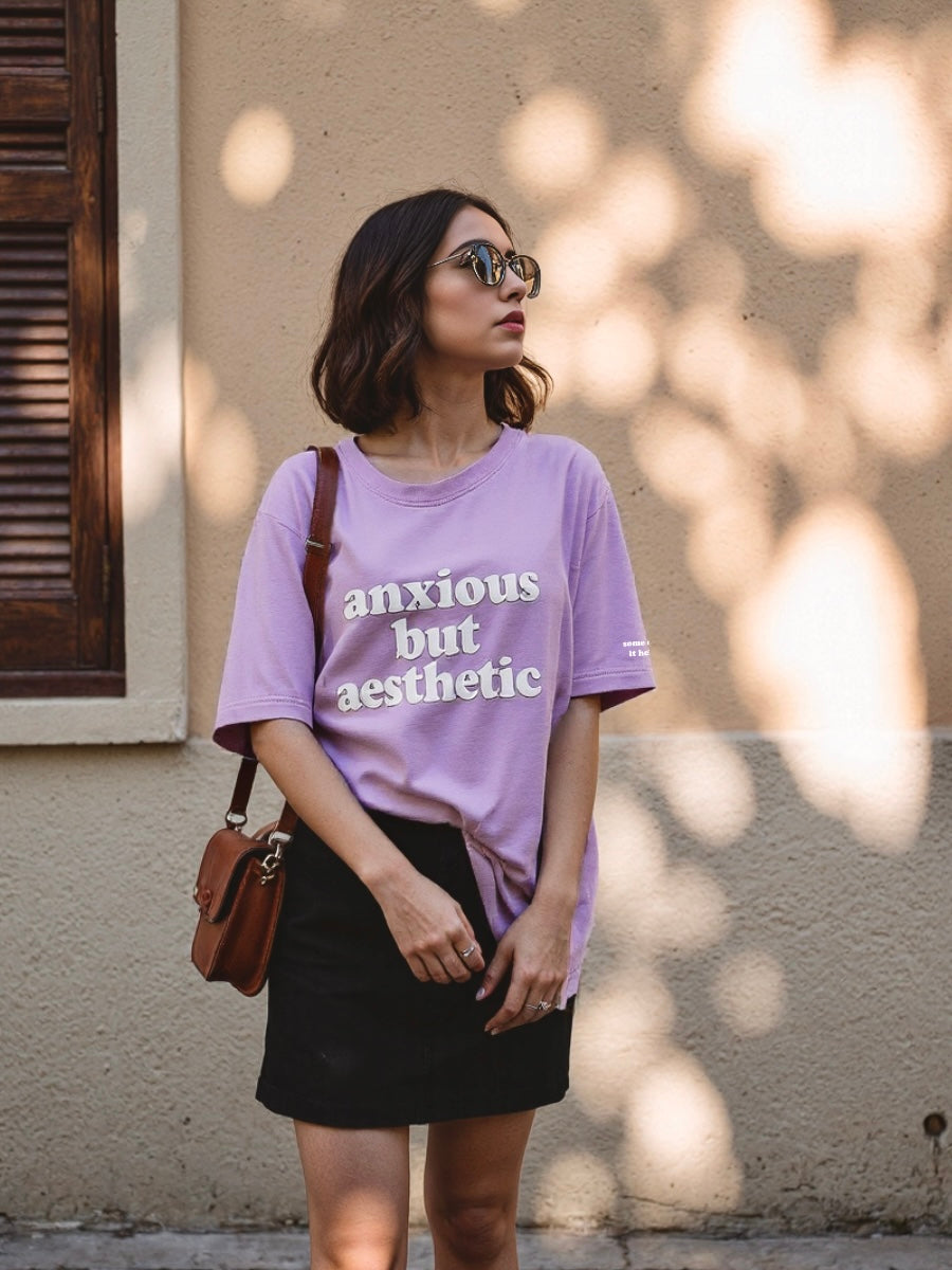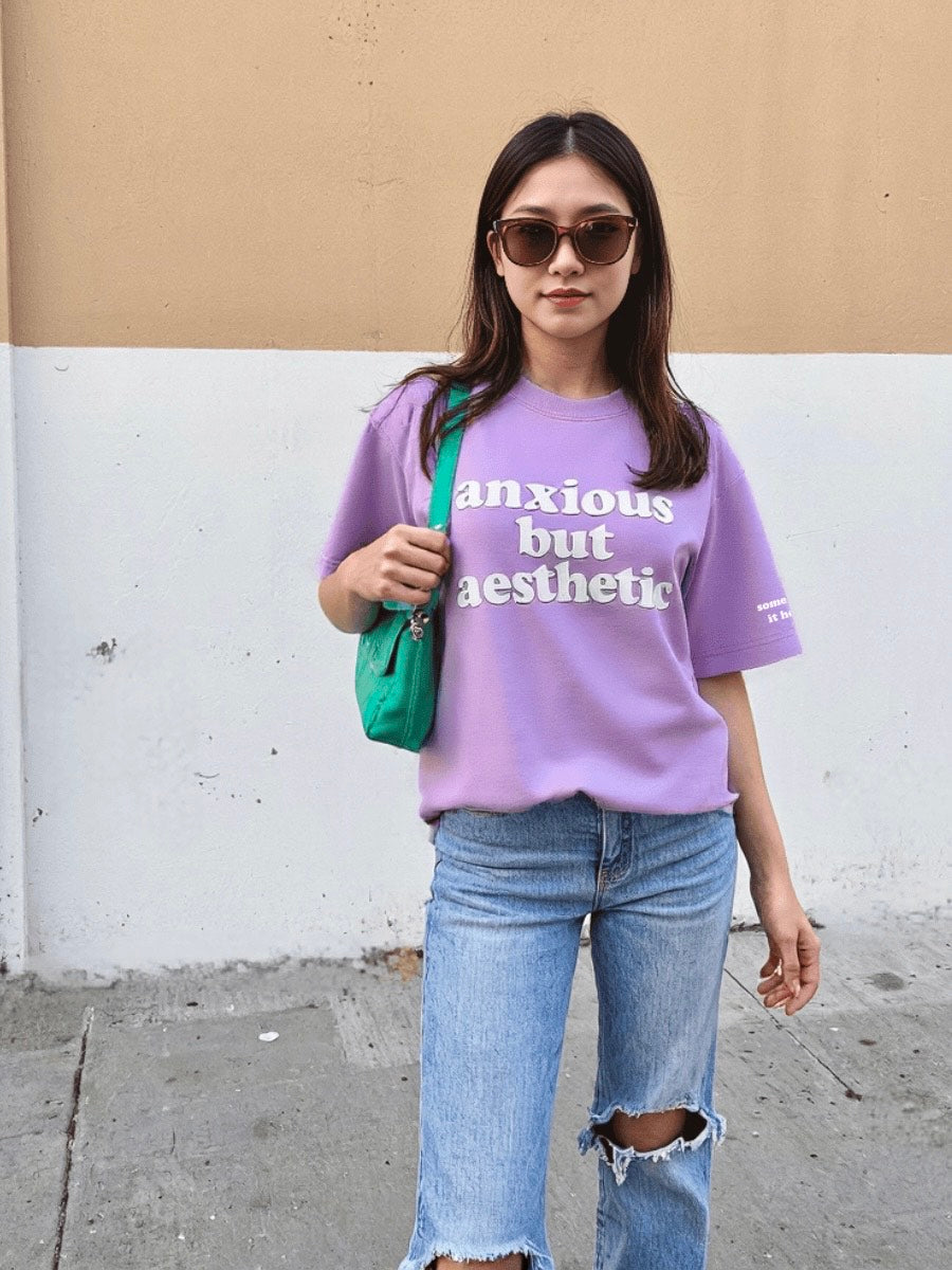Soft on the outside, spiraling on the inside. This oversized lavender tee says “anxious but aesthetic” so you don’t have to.