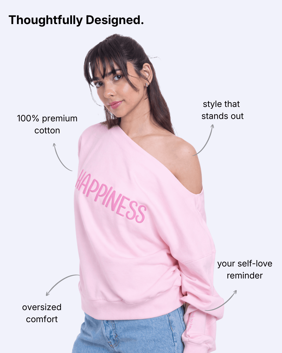 The word HAPPINESS is finished in a raised tonal puff print, giving the front a premium, textured lift that feels soft yet striking.